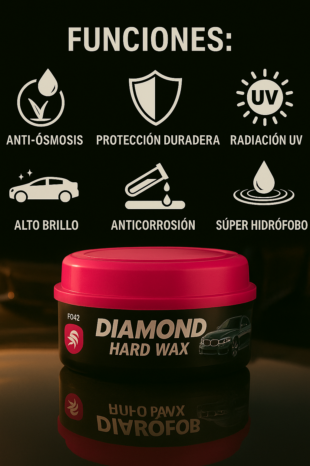 Cera carnauba con nano-materiales. Forma una película de cera fuerte de gran resistencia en la carrocería del automóvil. camufla pequeñas rayas, entrega Repelencia , realza el color, con filtro UV